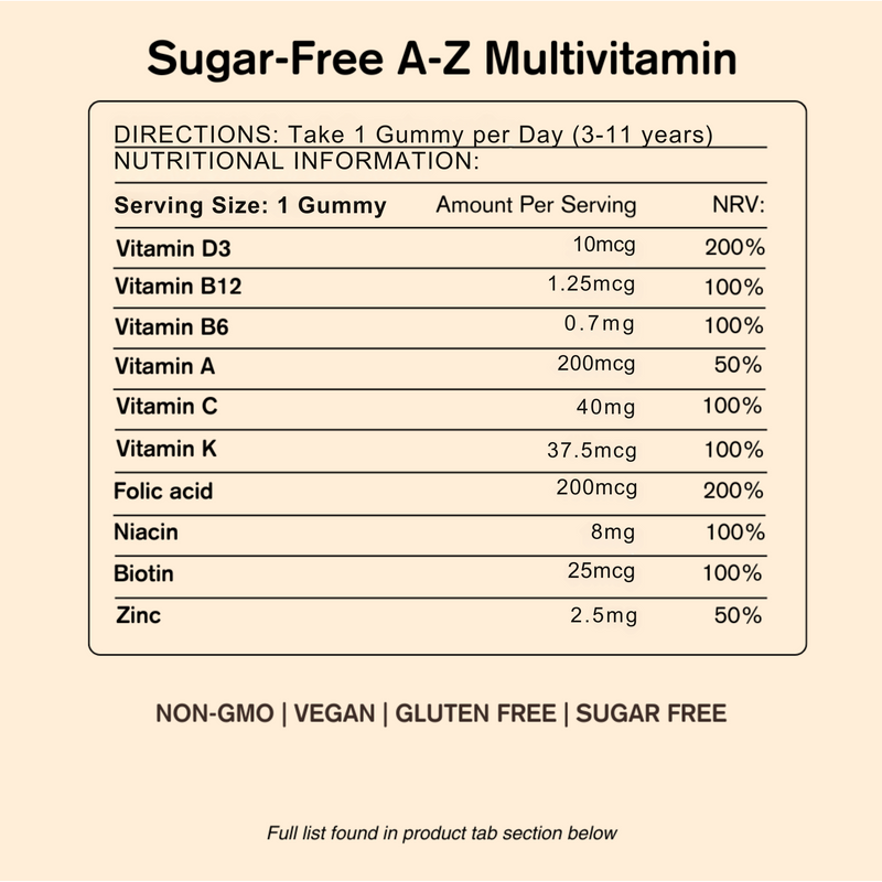 The Sugar-Free A-Z Multivitamin is designed to be the perfect all-rounder for any diet. It gives you the full spectrum of vitamins and minerals from A to Z, providing a wonderfully tasty nutritional safety net to keep you and your family healthy. What’s more, it's also sugar-free and certified by the vegan society.