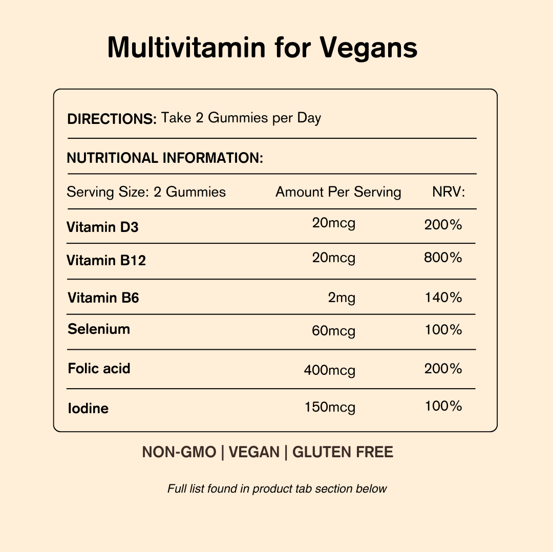 This multivitamin gummy is great for vegans because it includes essential nutrients like Vitamin B12 and Vitamin D3, which are often limited in a vegan diet. It's plant-based, meaning it contains no animal-derived ingredients!